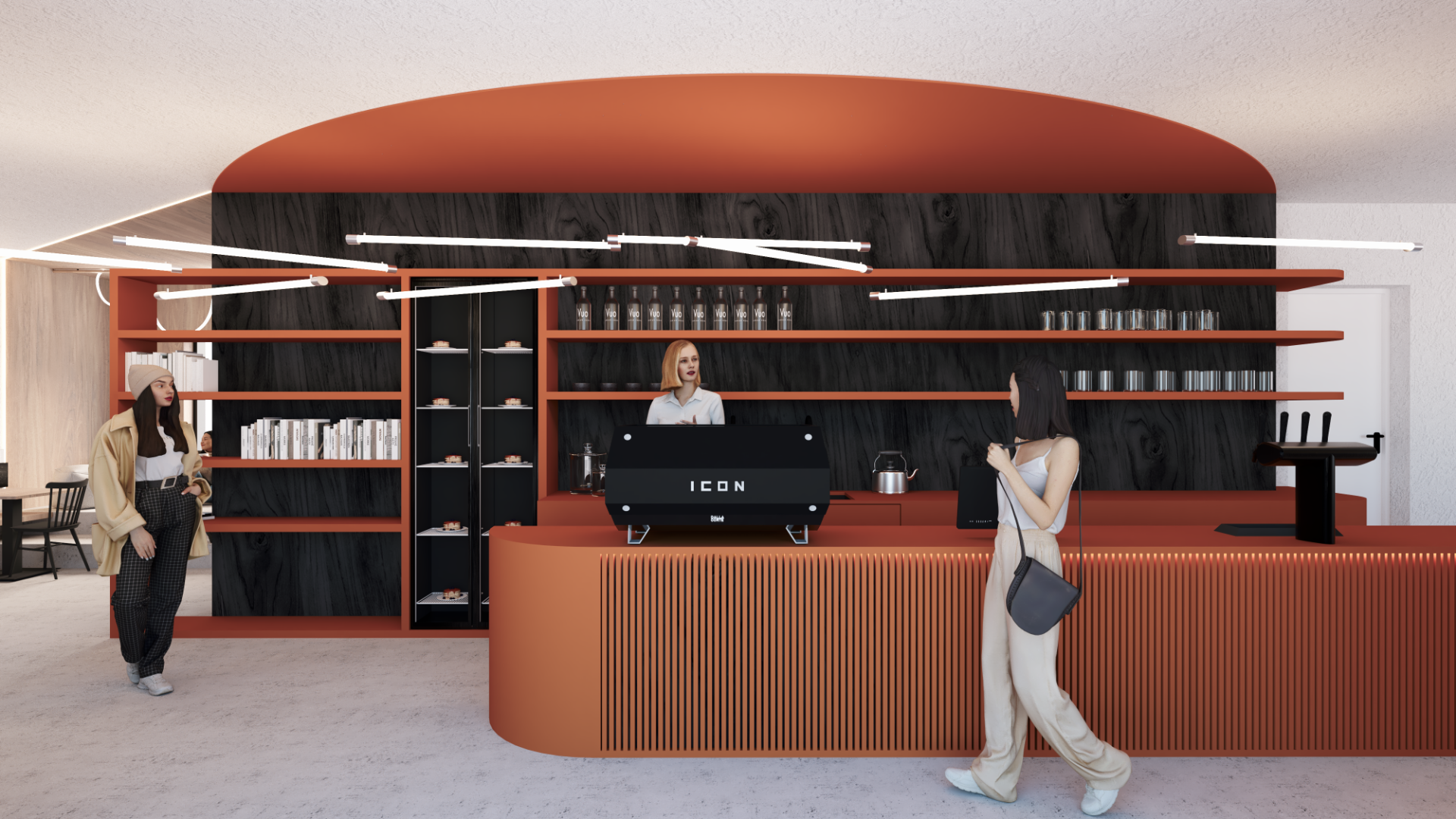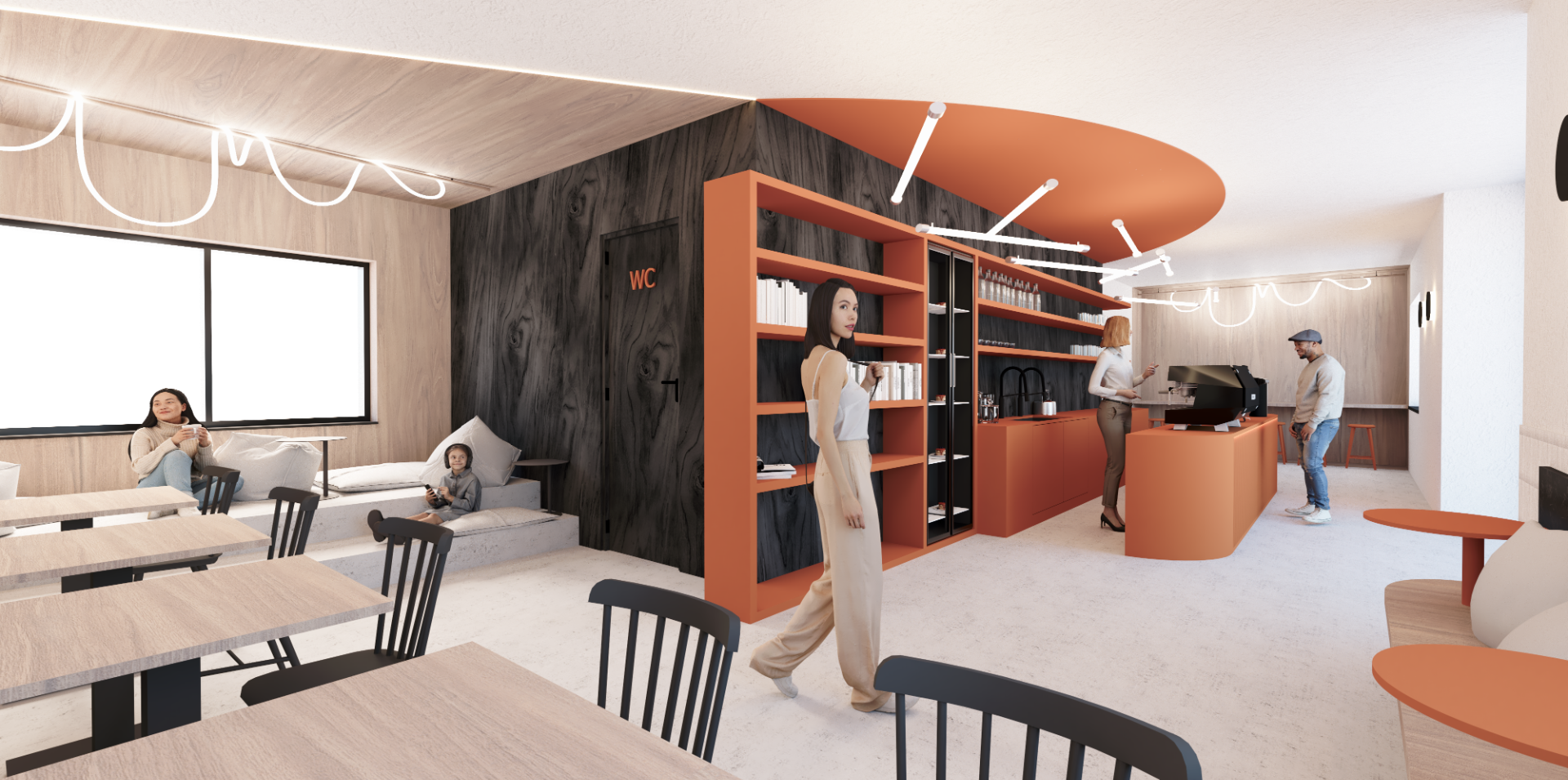 Oranžová barva se stává sjednocujícím motivem interiéru – objevuje se jak na dominantním vestavěném regálu, tak na hlavním baru, který tvoří centrální bod prostoru. Tento prvek dává kavárně jasnou identitu a zároveň zajišťuje přehlednou orientaci v interiéru.