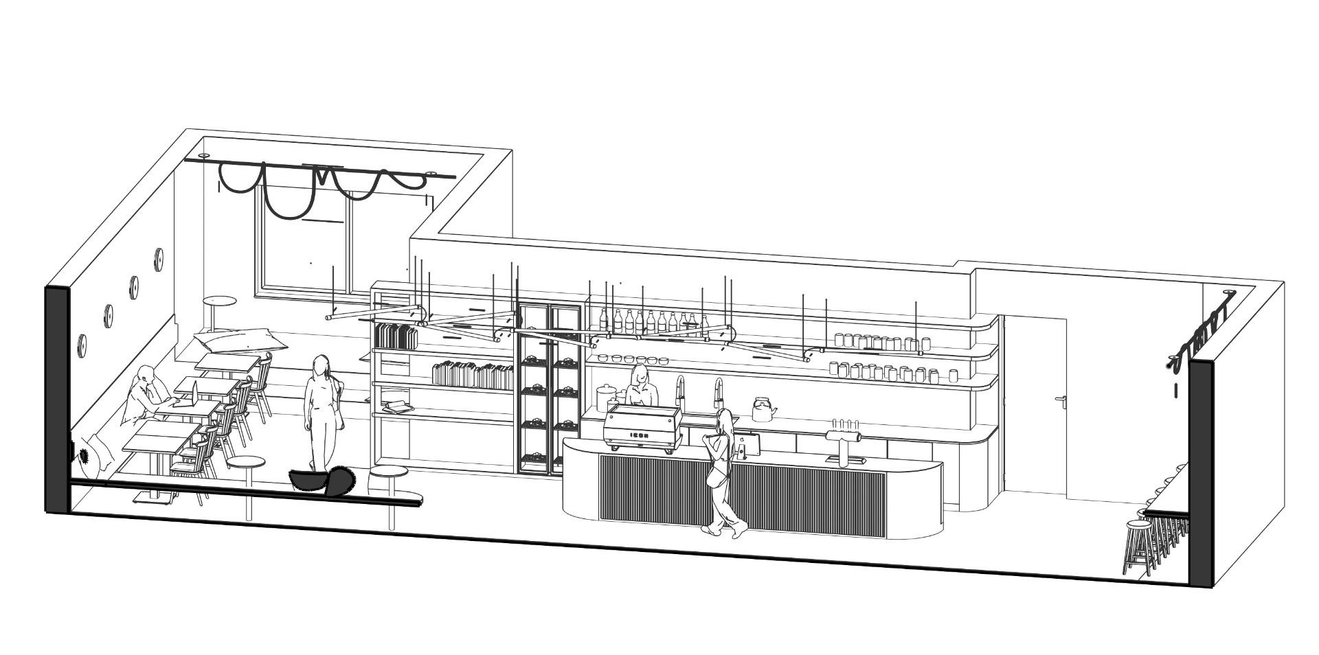Prostor je koncipován jako flexibilní a otevřený různým způsobům využití – od práce a setkávání až po klidné trávení času. Celkový výraz kavárny stojí na jednoduchosti, čistých liniích a promyšlené práci s detailem. Interiér nepůsobí prvoplánově komerčně, ale jako přirozené rozšíření domu – místo s jasným středem, vlastní identitou a důrazem na atmosféru.