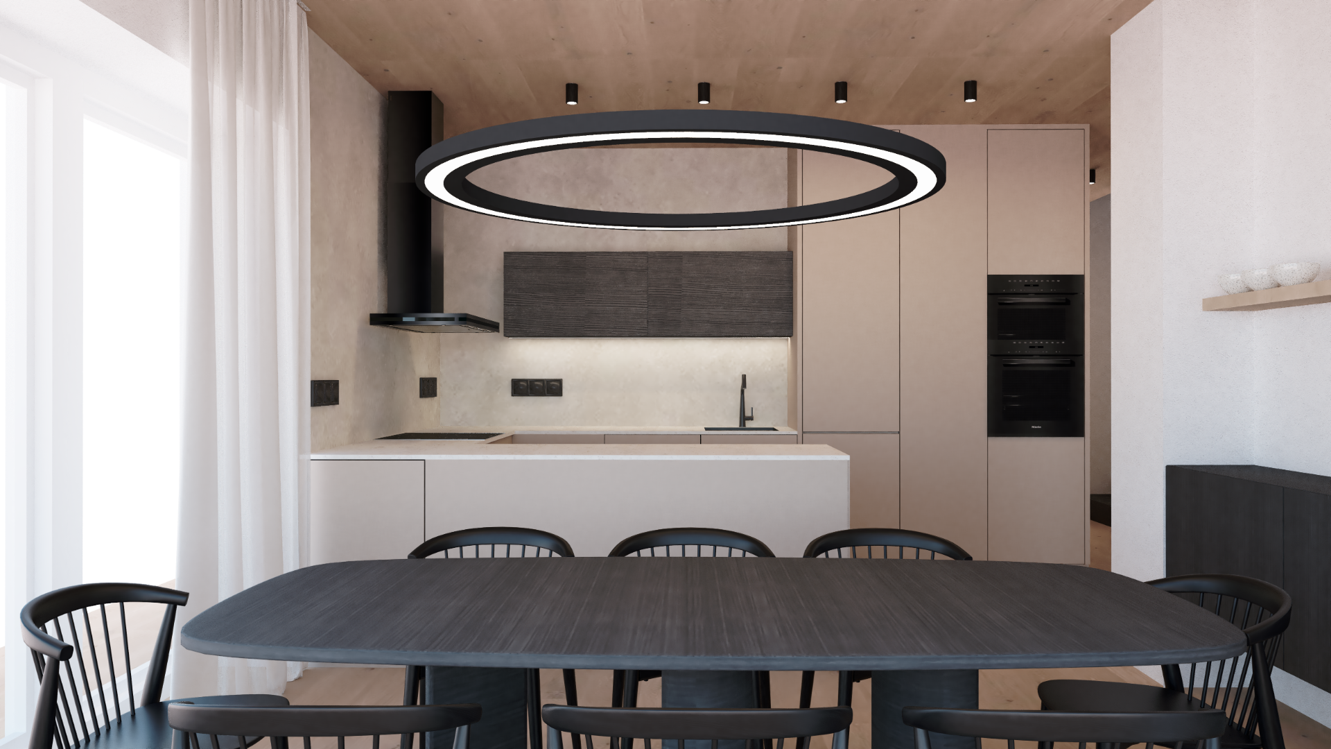 Interiér je postavený na práci s přírodními materiály a klidné, nadčasové barevnosti. Dřevo, jemné struktury a tlumené tóny vytváří harmonický celek, který působí přirozeně a nenuceně. Návrh stojí na jednoduchosti a čistých liniích. Každý prvek má své místo i funkci, nic není navíc. Minimalistické řešení nechává vyniknout materiálům samotným a podporuje pocit vzdušnosti a klidu v prostoru. Celkově jde o interiér, který nepodléhá trendům, ale stojí na přirozenosti, jednoduchosti a dlouhodobé udržitelnosti.